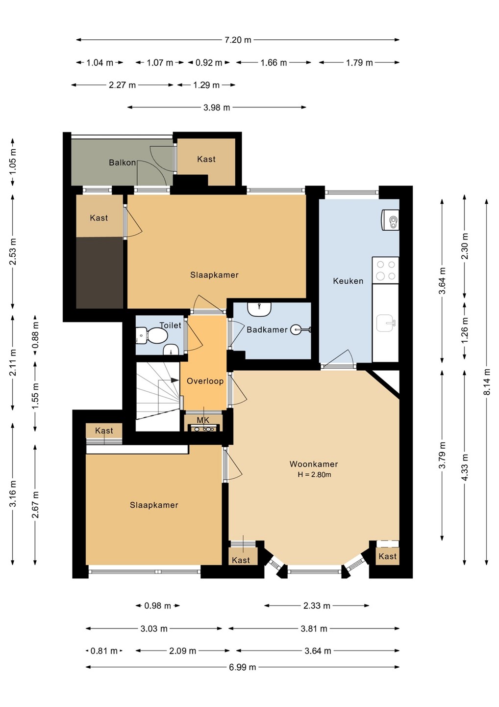 Overloop met toegang tot het toilet, badkamer en meterkast. Woonkamer met erker, gesloten keuken, slaapkamer met vaste kast aan de voorkant, slaapkamer met vaste kast en toegang tot het balkon aan de achterkant