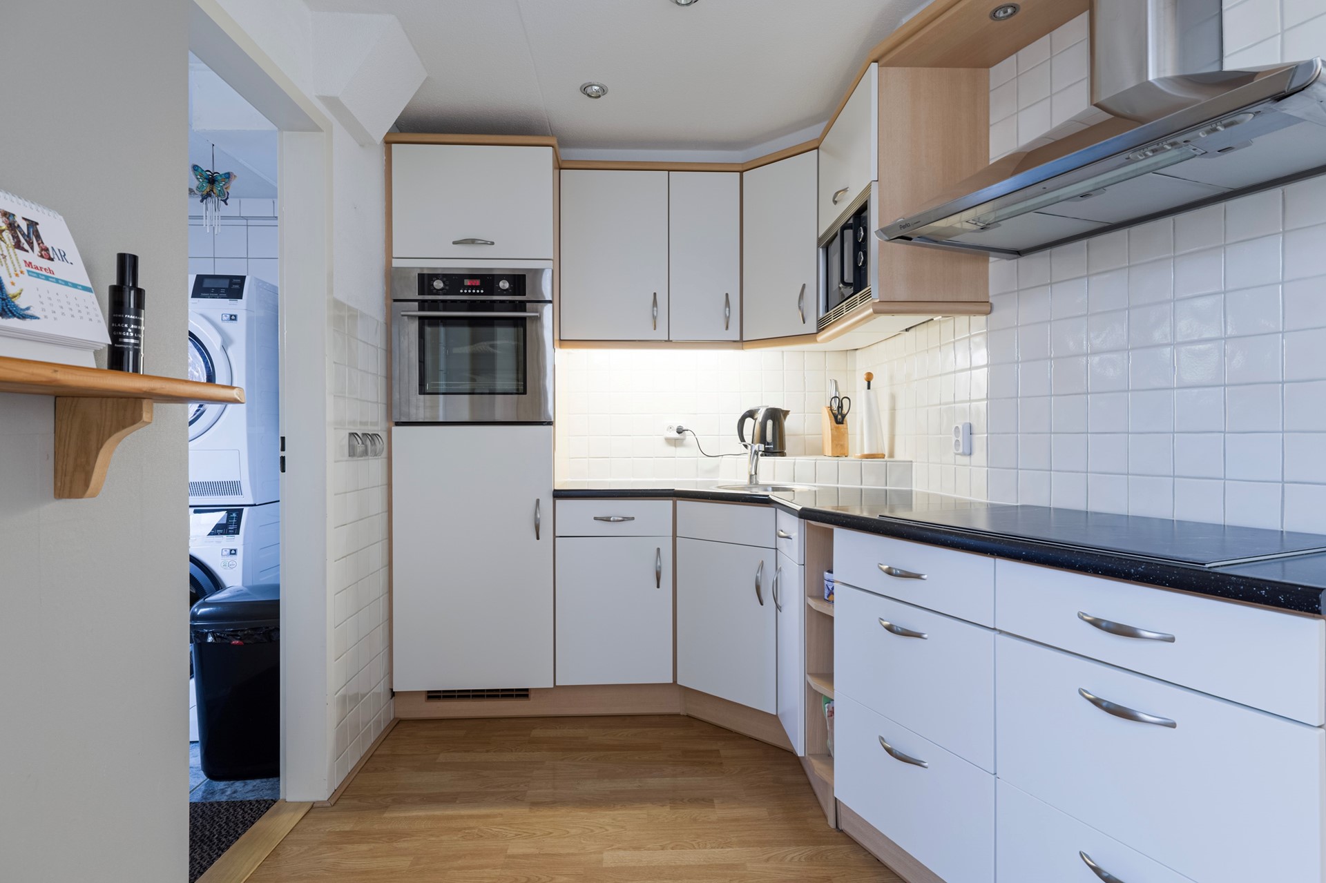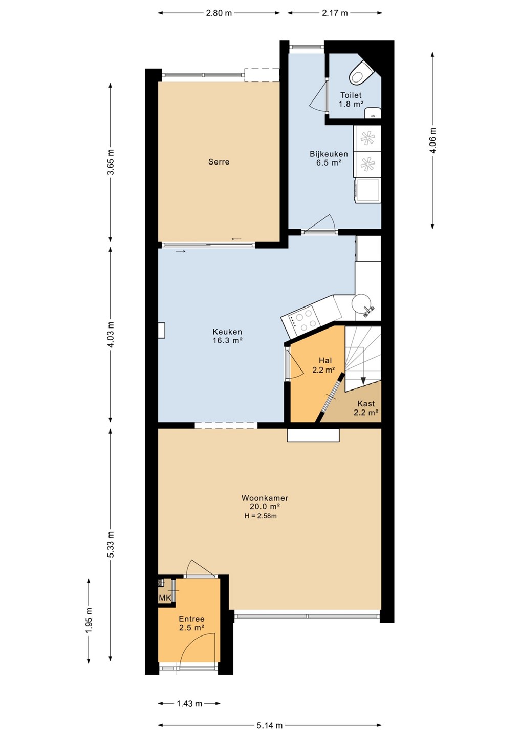 Entree/tochtportaal met meterkast. Lichte woonkamer met en-suite deuren naar de keuken (voorzien van inductiekookplaat, koelkast, oven, magnetron en afzuigkap). Tussenhal met trapopgang. Praktische bijkeuken met toilet en toegang tot de serre.