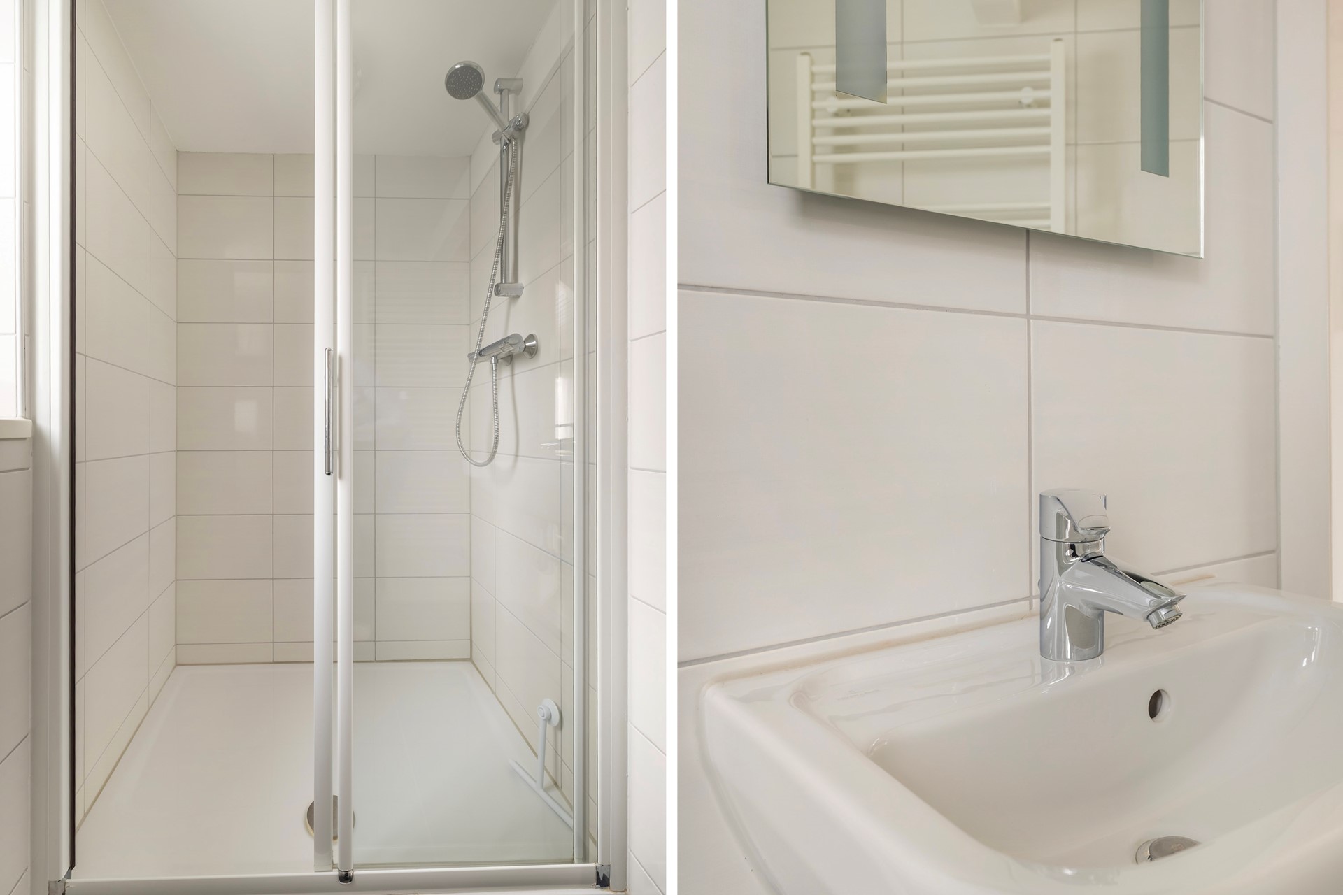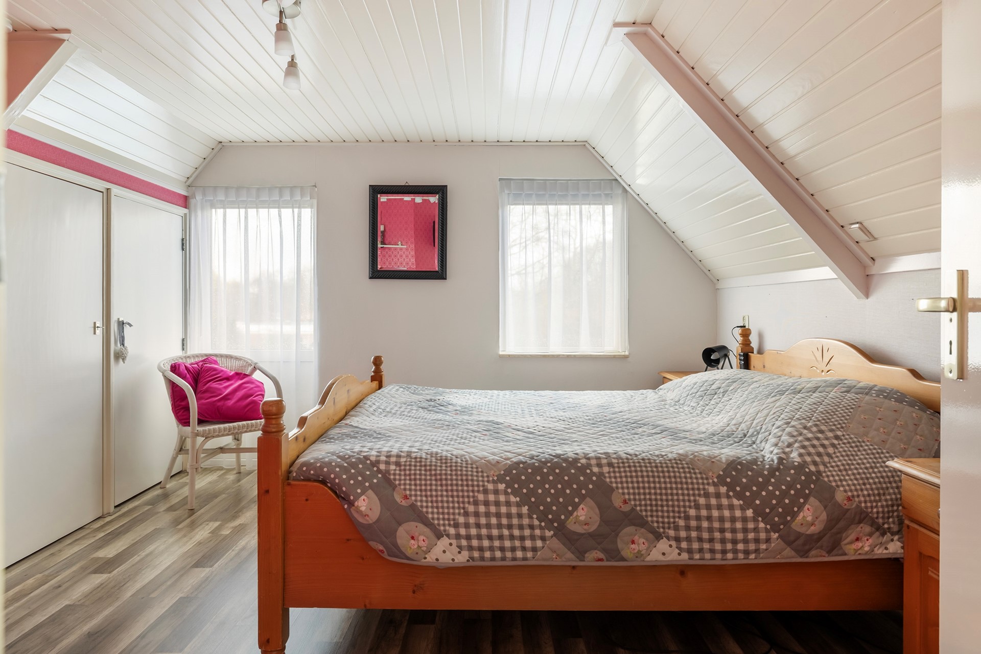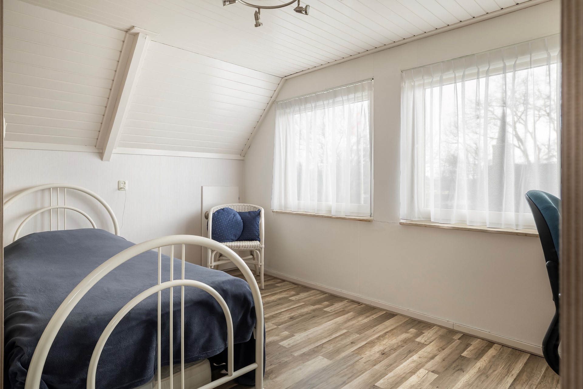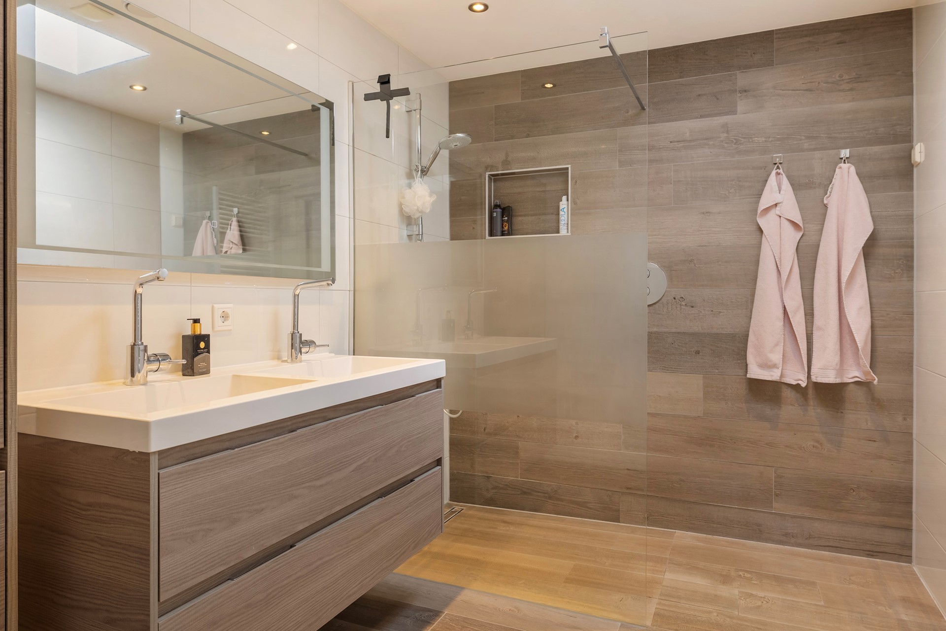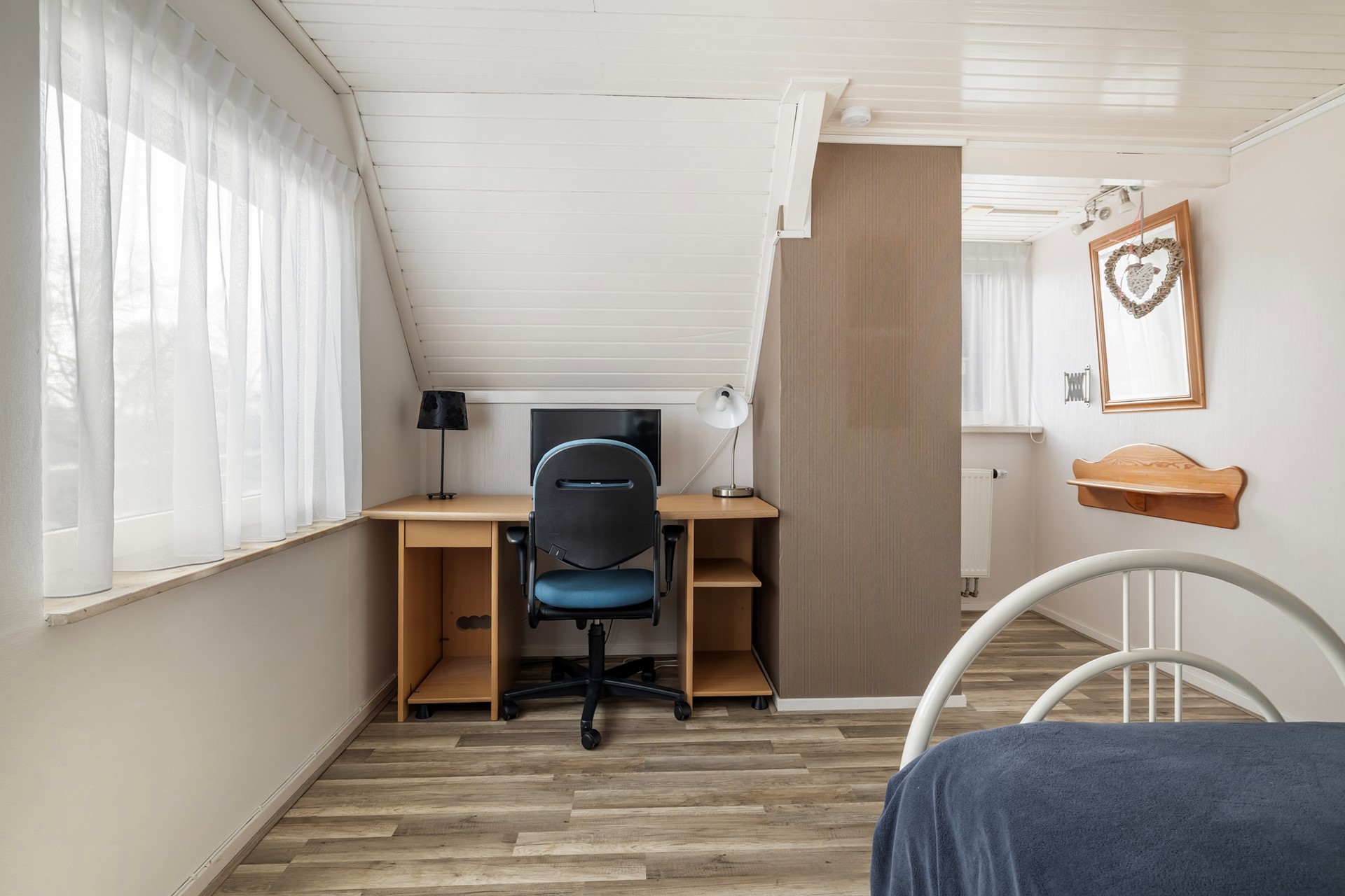De overloop geeft toegang tot twee ruime, lichte slaapkamers. Daarnaast bevindt zich hier een tweede badkamer, uitgerust met een douche, wastafel en toilet. Ideaal voor gasten of de rest van het gezin.