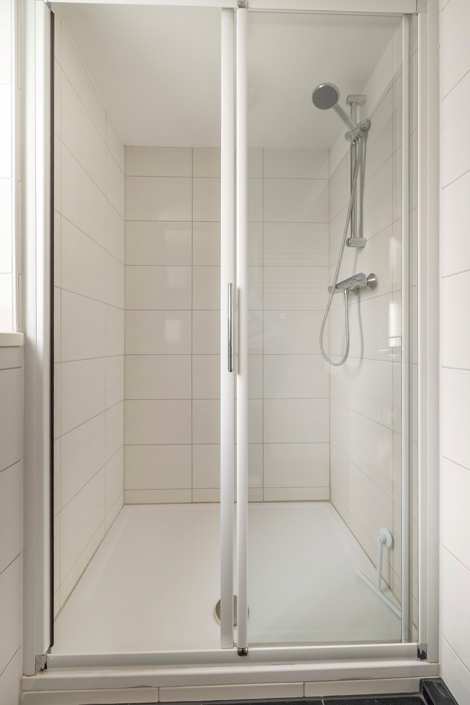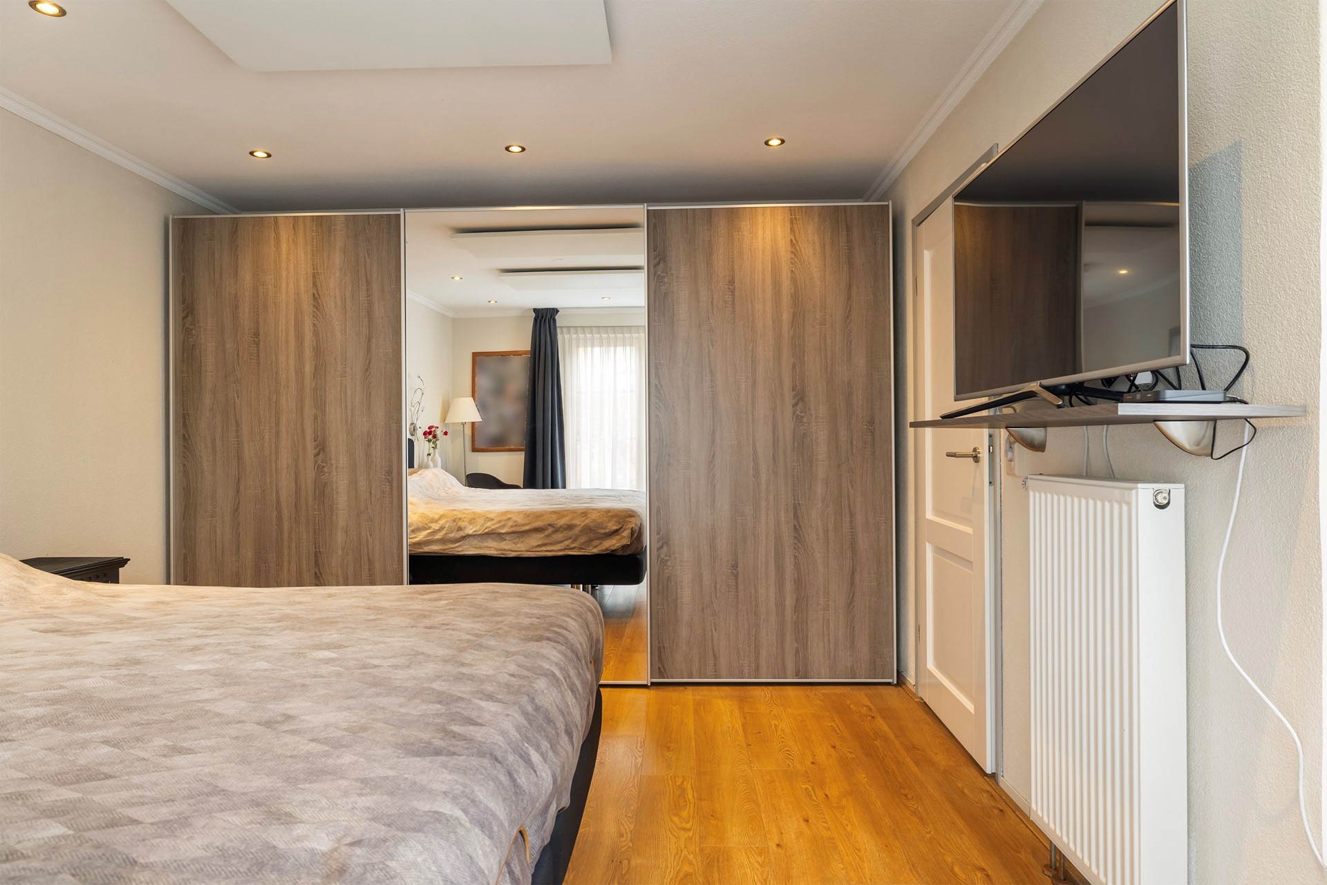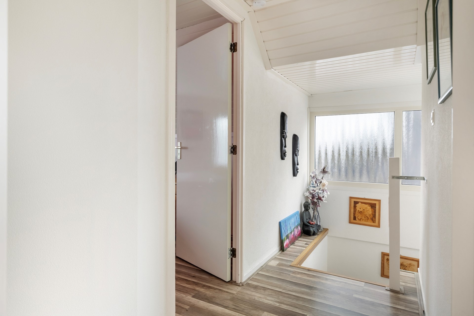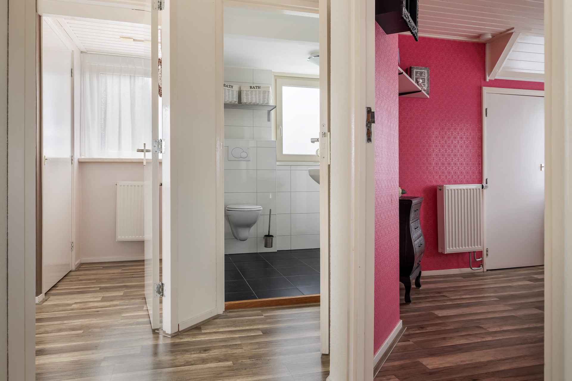 De overloop geeft toegang tot twee ruime, lichte slaapkamers. Daarnaast bevindt zich hier een tweede badkamer, uitgerust met een douche, wastafel en toilet. Ideaal voor gasten of de rest van het gezin.