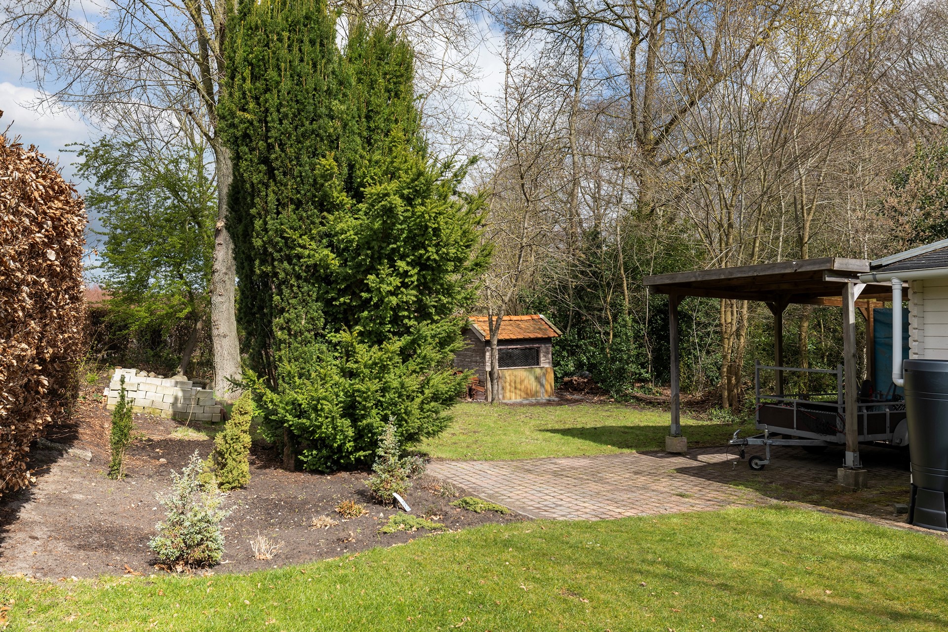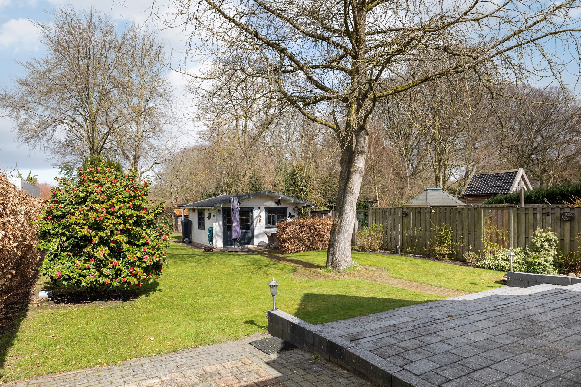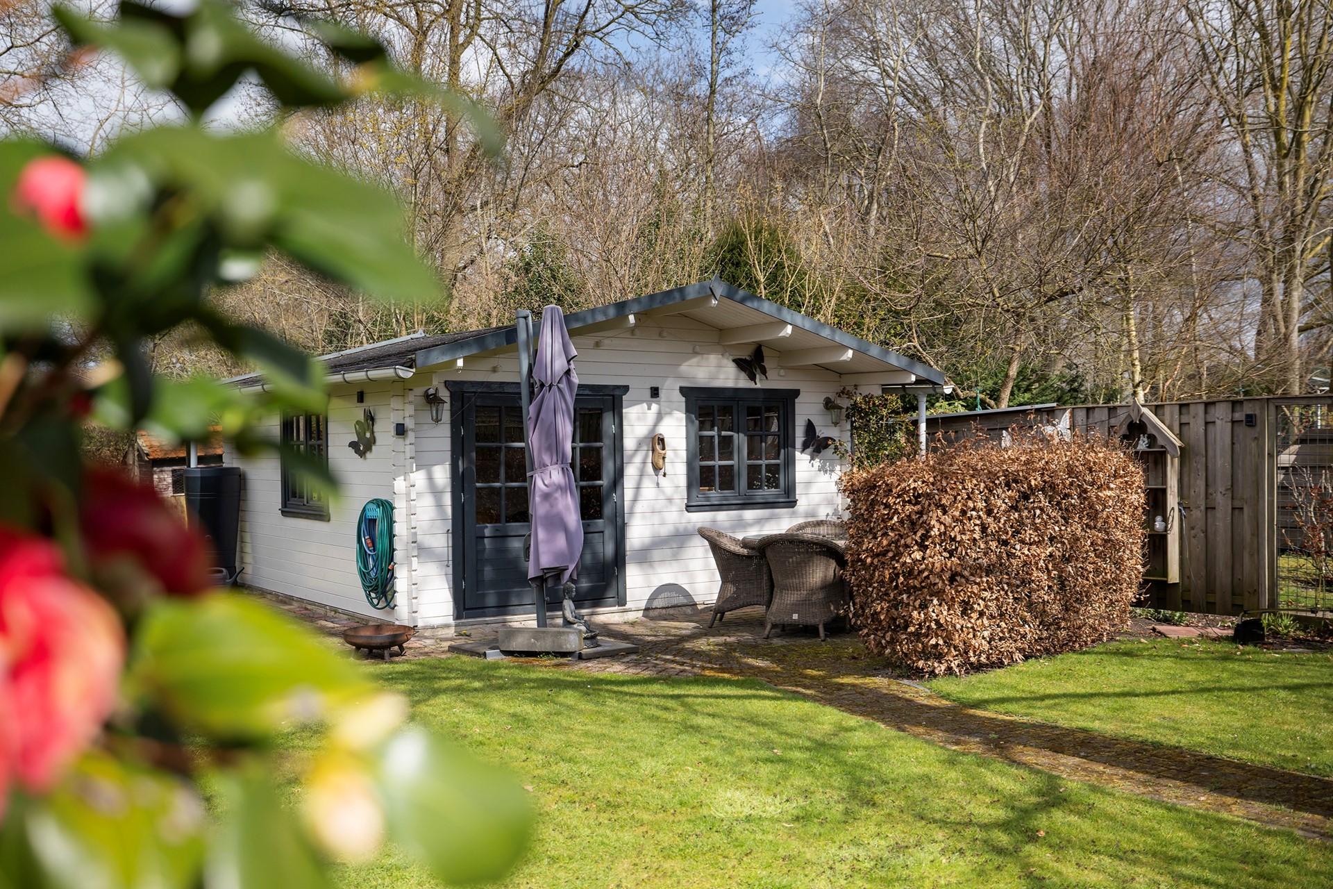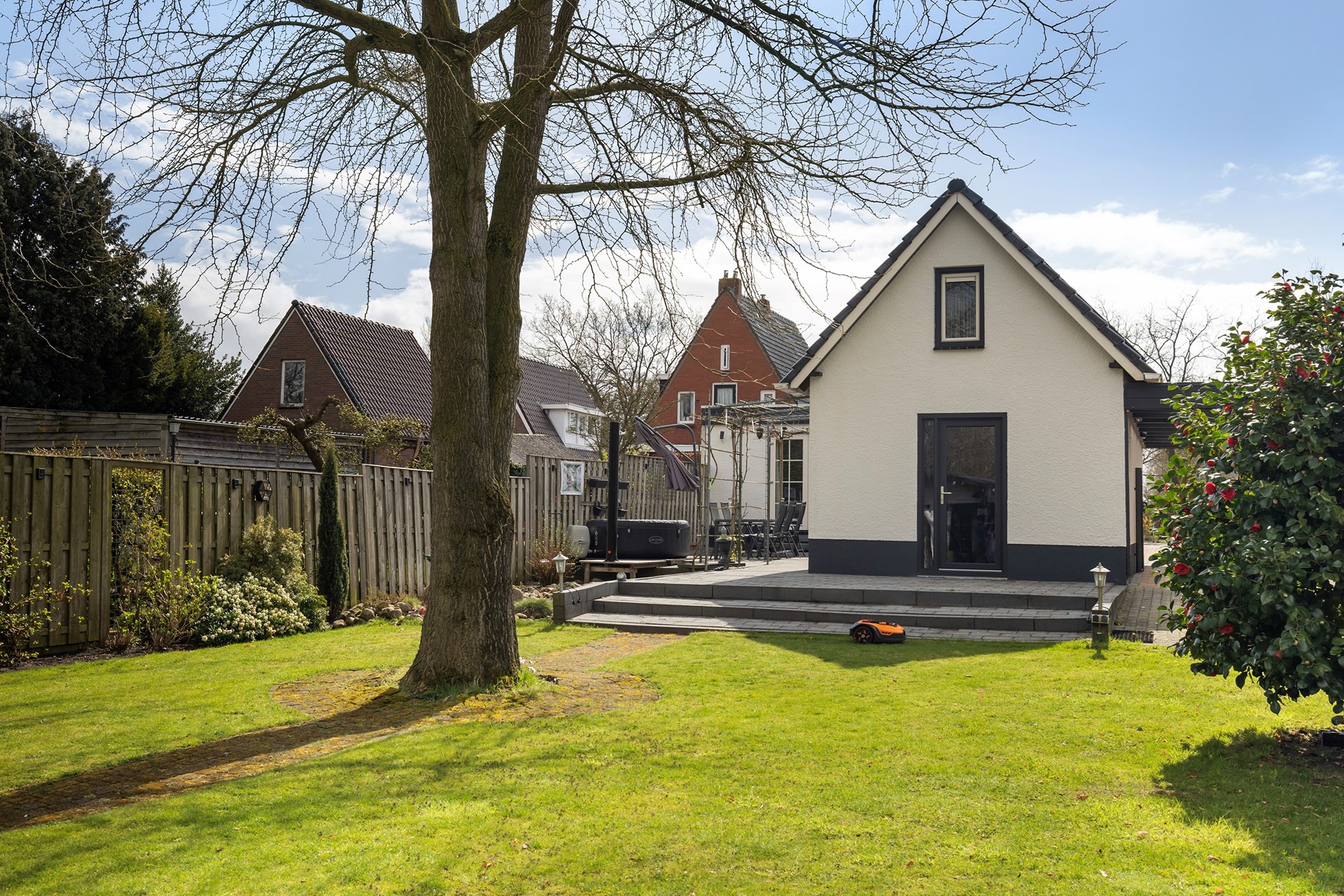 Buitenleven op z'n best De buitenruimte is werkelijk een paradijs. De diepe achtertuin is prachtig aangelegd met diverse terrassen, waardoor er altijd een plekje in de zon of schaduw te vinden is. • Garage & Carport: Een ruime vrijstaande stenen garage (met spouwmuur en kap) en een aangebouwde carport bieden volop ruimte voor auto’s, hobby’s of opslag. • De blokhu: Achter in de tuin staat een vrijstaande houten blokhut met eigen pelletkachel. De perfecte plek voor een "man-cave", atelier of gewoon voor de fijne avonduurtjes met vrienden. • Ligging: Gelegen aan vaar- en viswater, dus gooi gerust een hengeltje uit!
