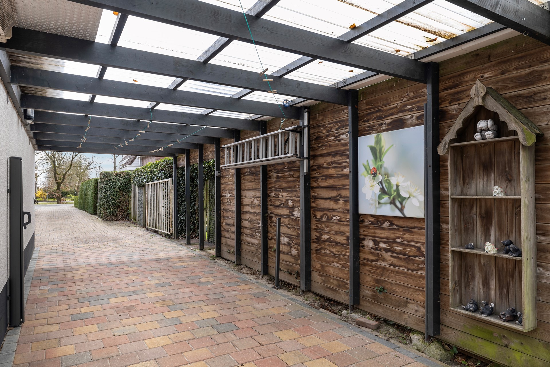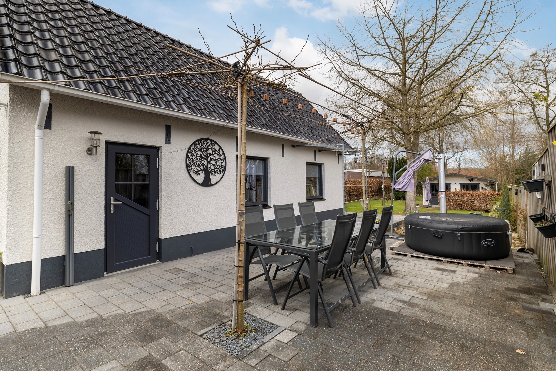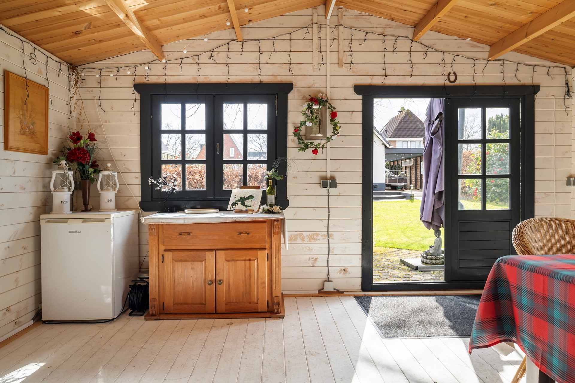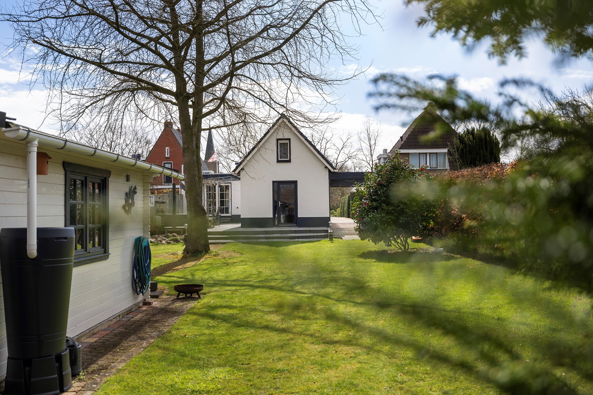 Buitenleven op z'n best De buitenruimte is werkelijk een paradijs. De diepe achtertuin is prachtig aangelegd met diverse terrassen, waardoor er altijd een plekje in de zon of schaduw te vinden is. • Garage & Carport: Een ruime vrijstaande stenen garage (met spouwmuur en kap) en een aangebouwde carport bieden volop ruimte voor auto’s, hobby’s of opslag. • De blokhu: Achter in de tuin staat een vrijstaande houten blokhut met eigen pelletkachel. De perfecte plek voor een "man-cave", atelier of gewoon voor de fijne avonduurtjes met vrienden. • Ligging: Gelegen aan vaar- en viswater, dus gooi gerust een hengeltje uit!