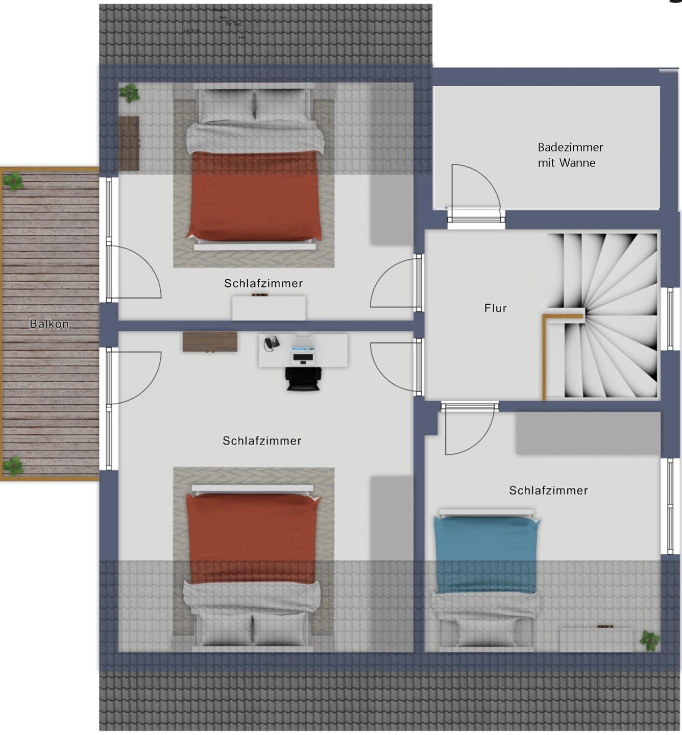 Overloop, drie slaapkamers, badkamer met ligbad, balkon