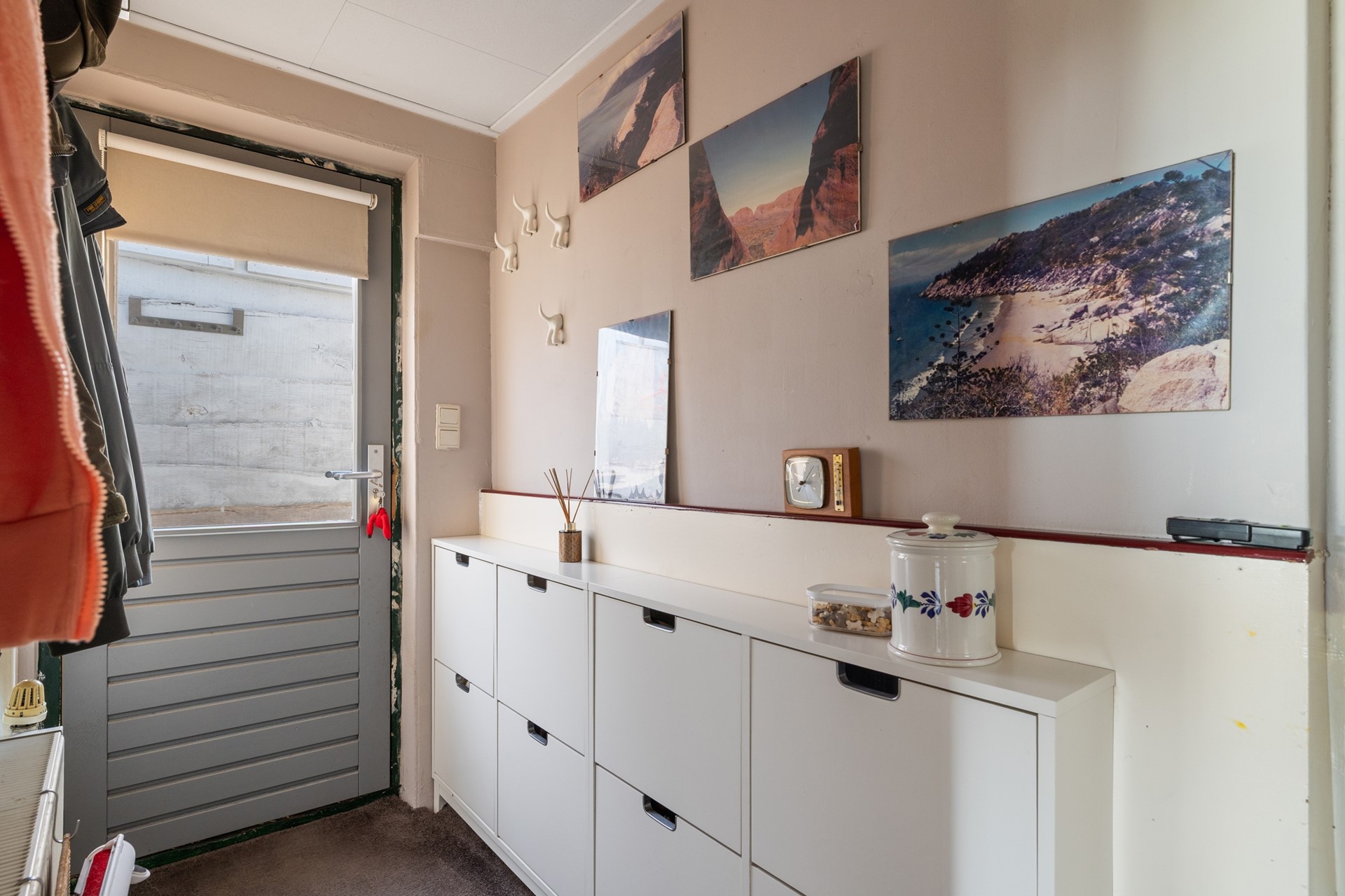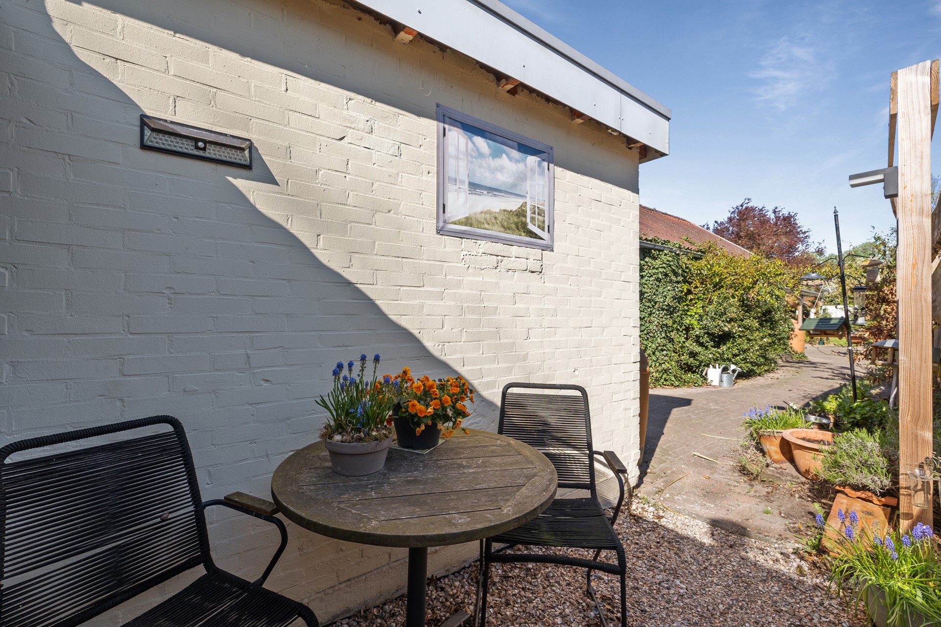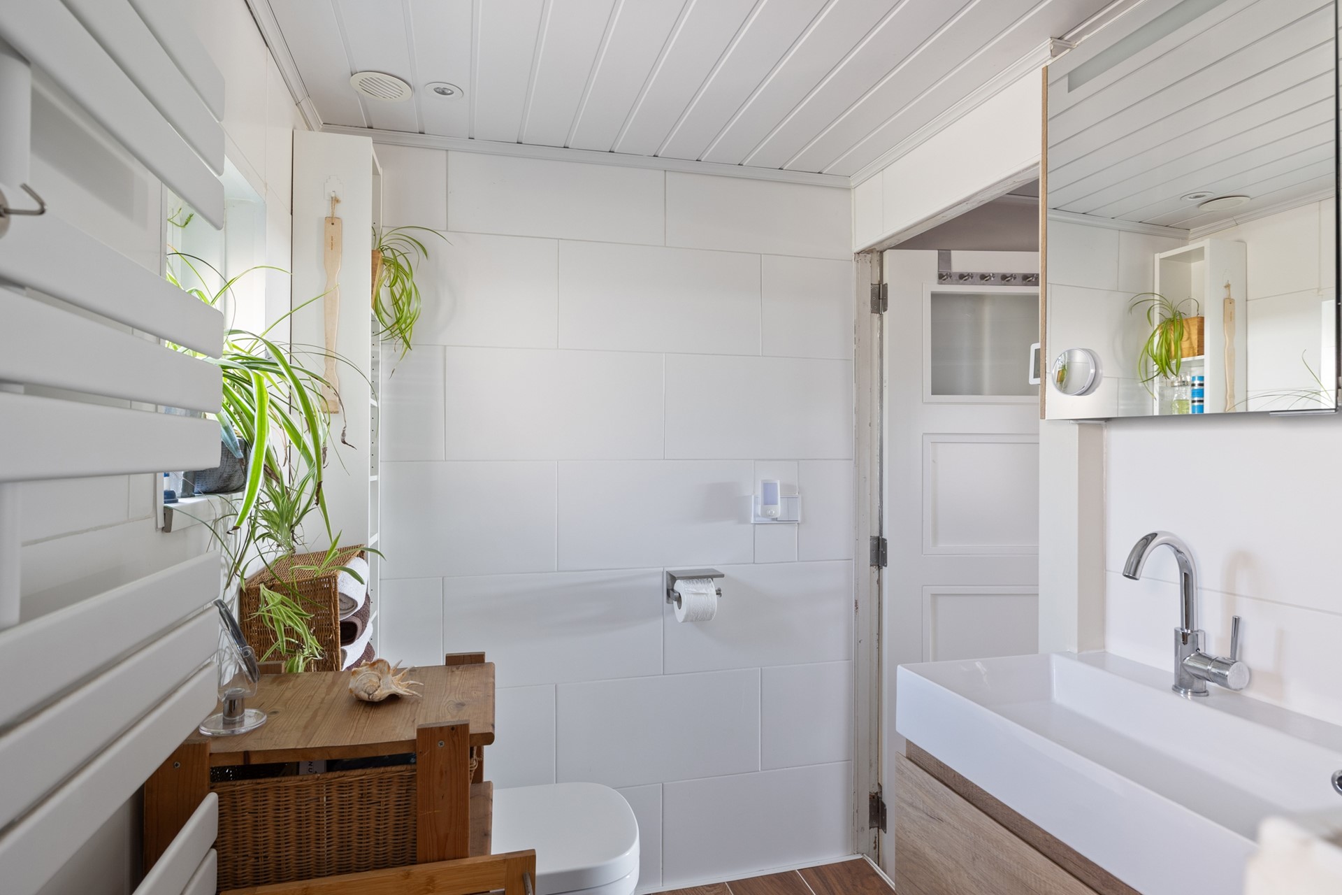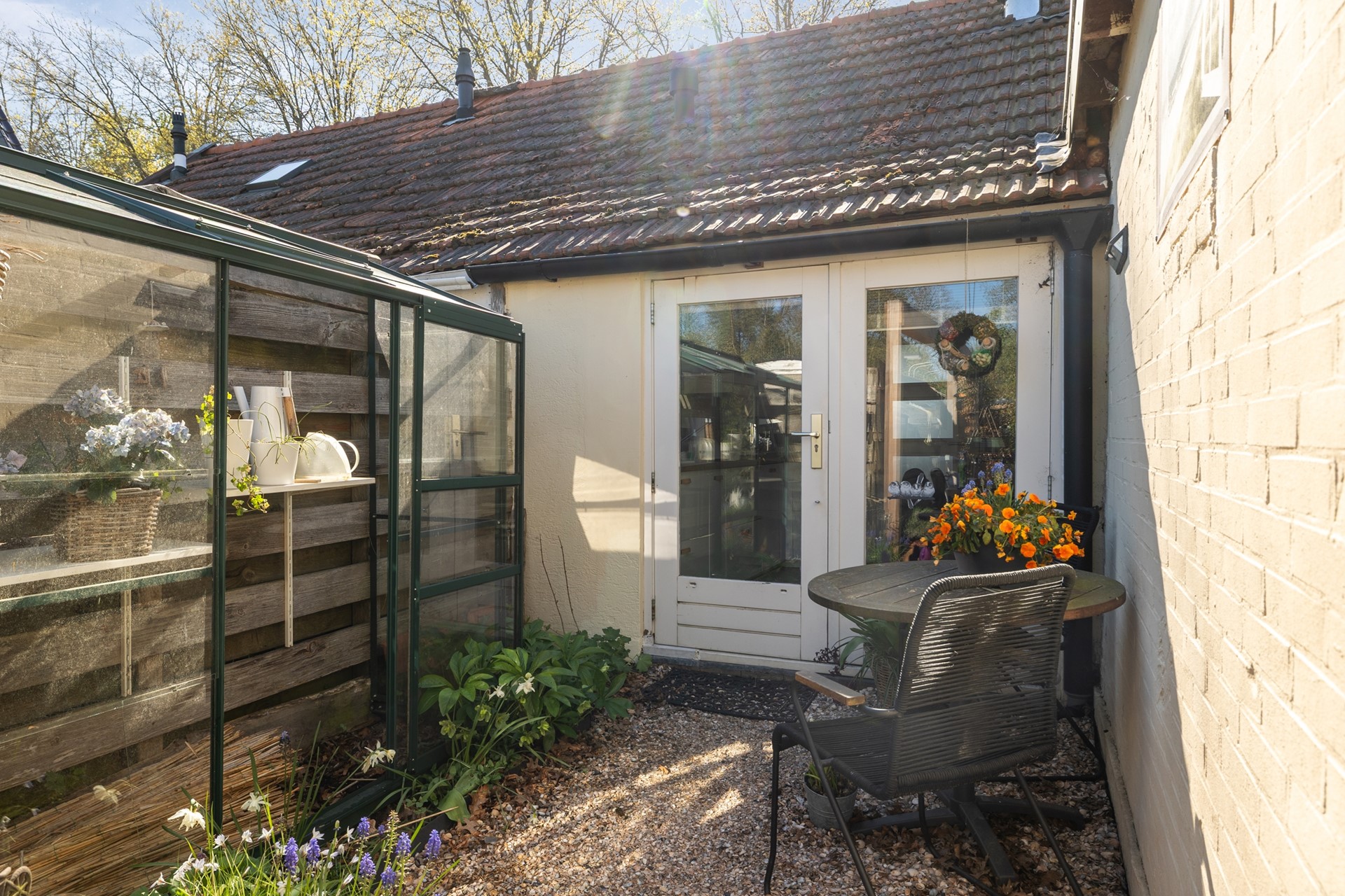 Binnenkomst via het praktische 'klompenhok' naar de hal. De lichte woonkamer loopt over in de moderne keuken, die dankzij de tuindeuren direct toegang biedt tot het terras. Verder vindt u hier de bijkeuken (met trapopgang), een berging, CV-kast en de vernieuwde, stijlvolle badkamer.