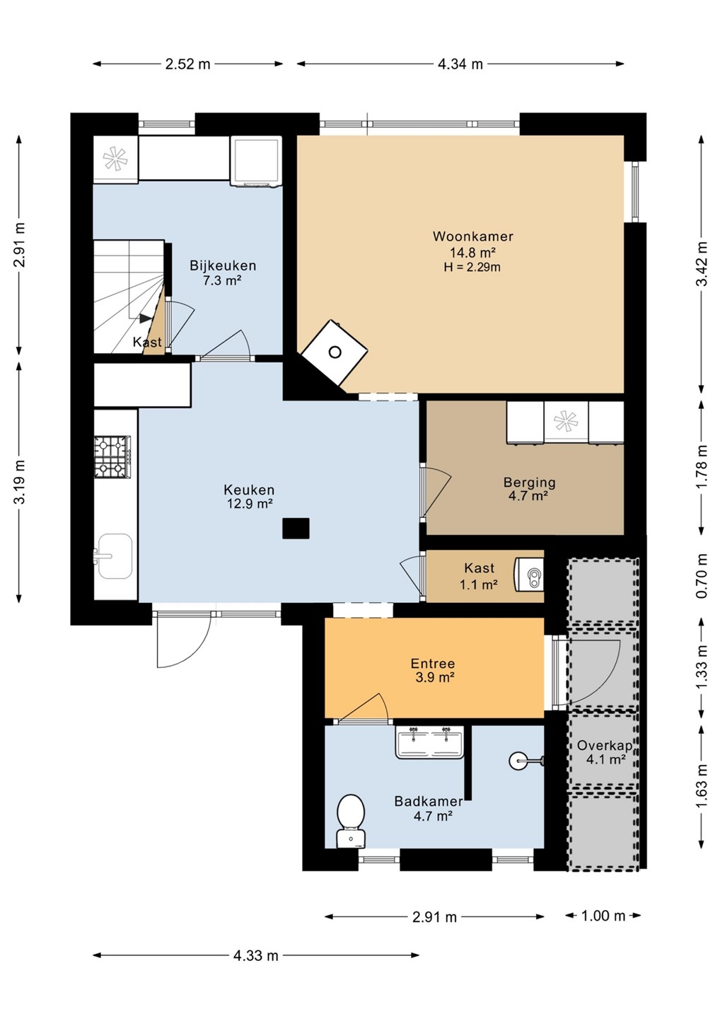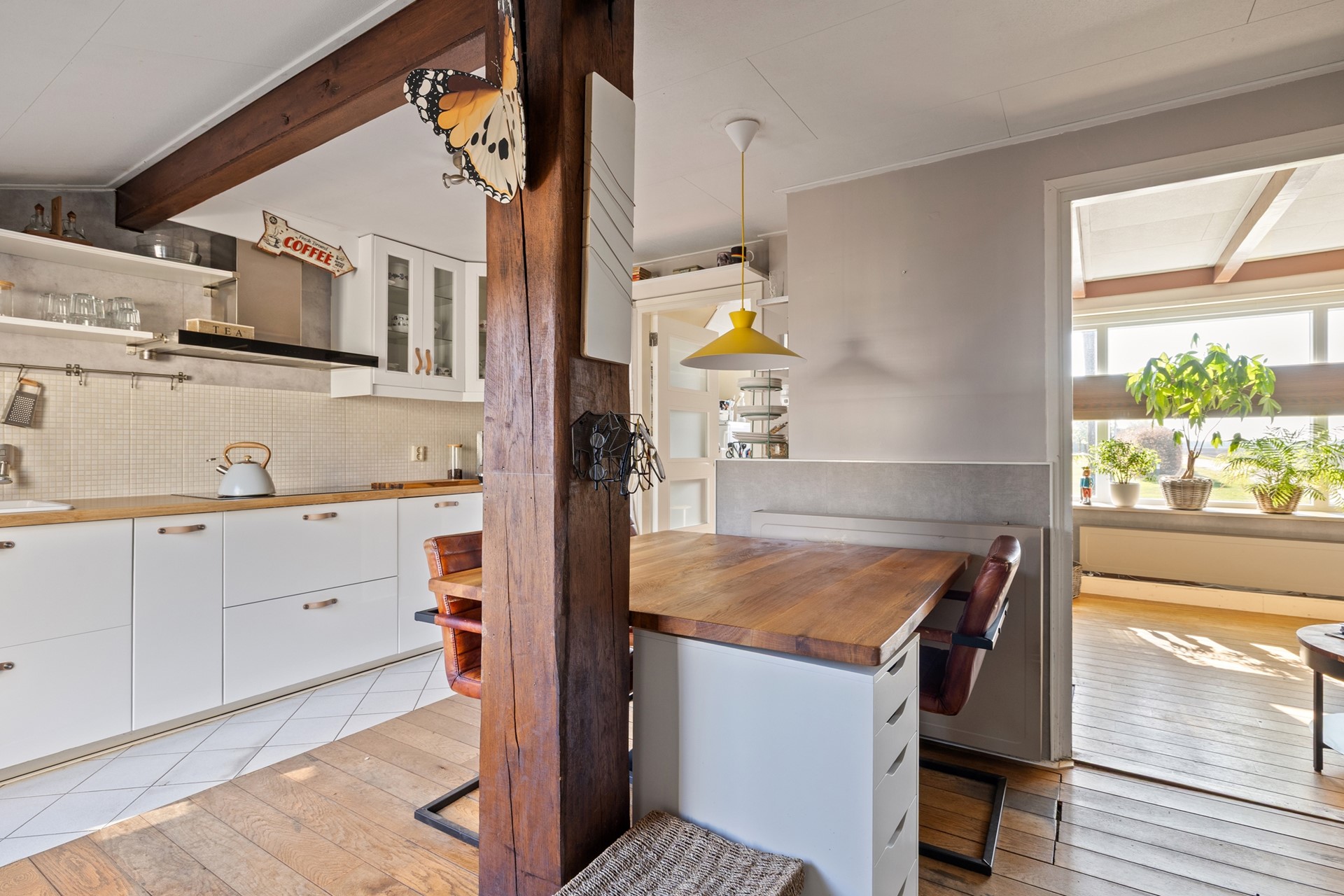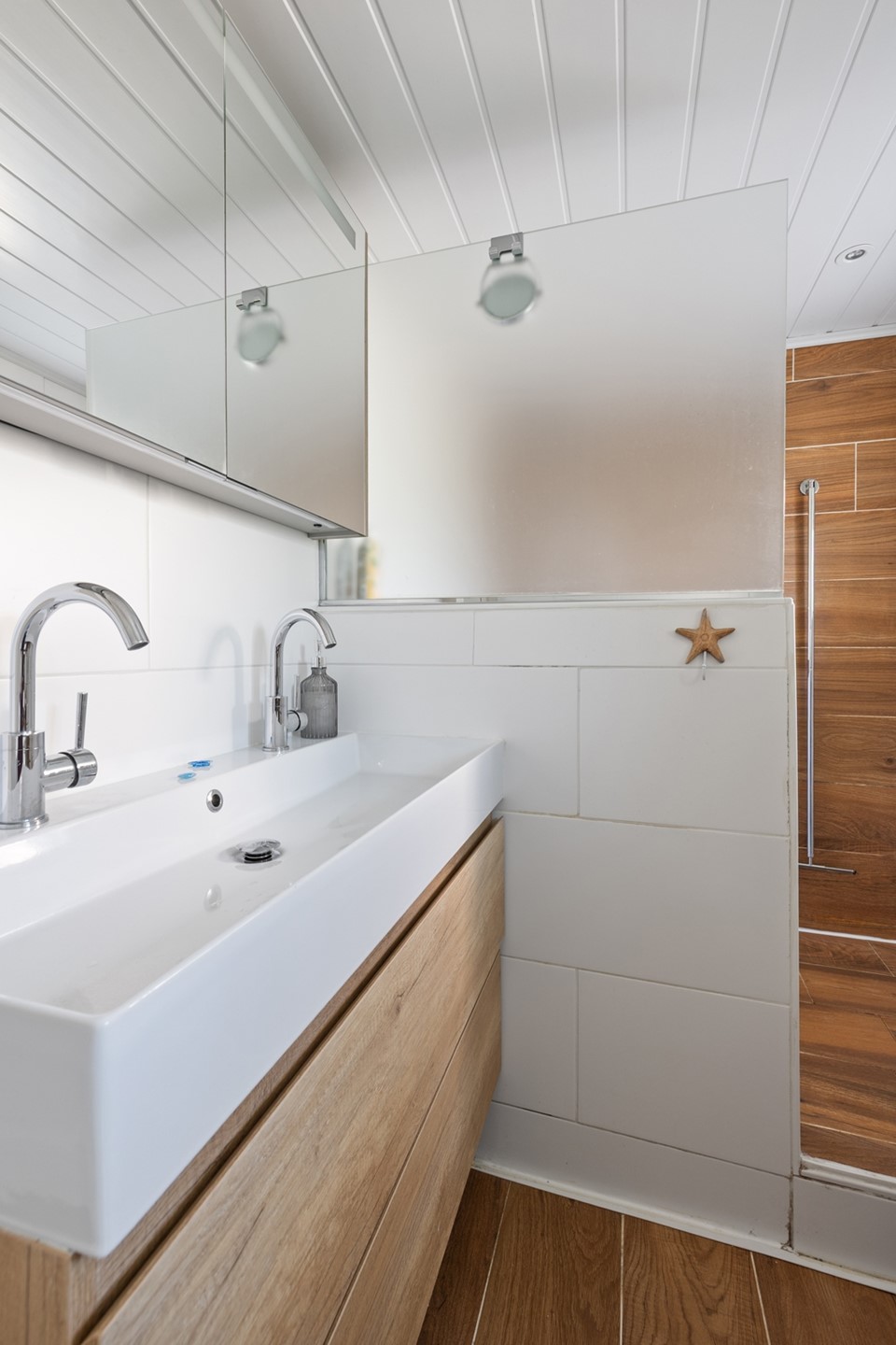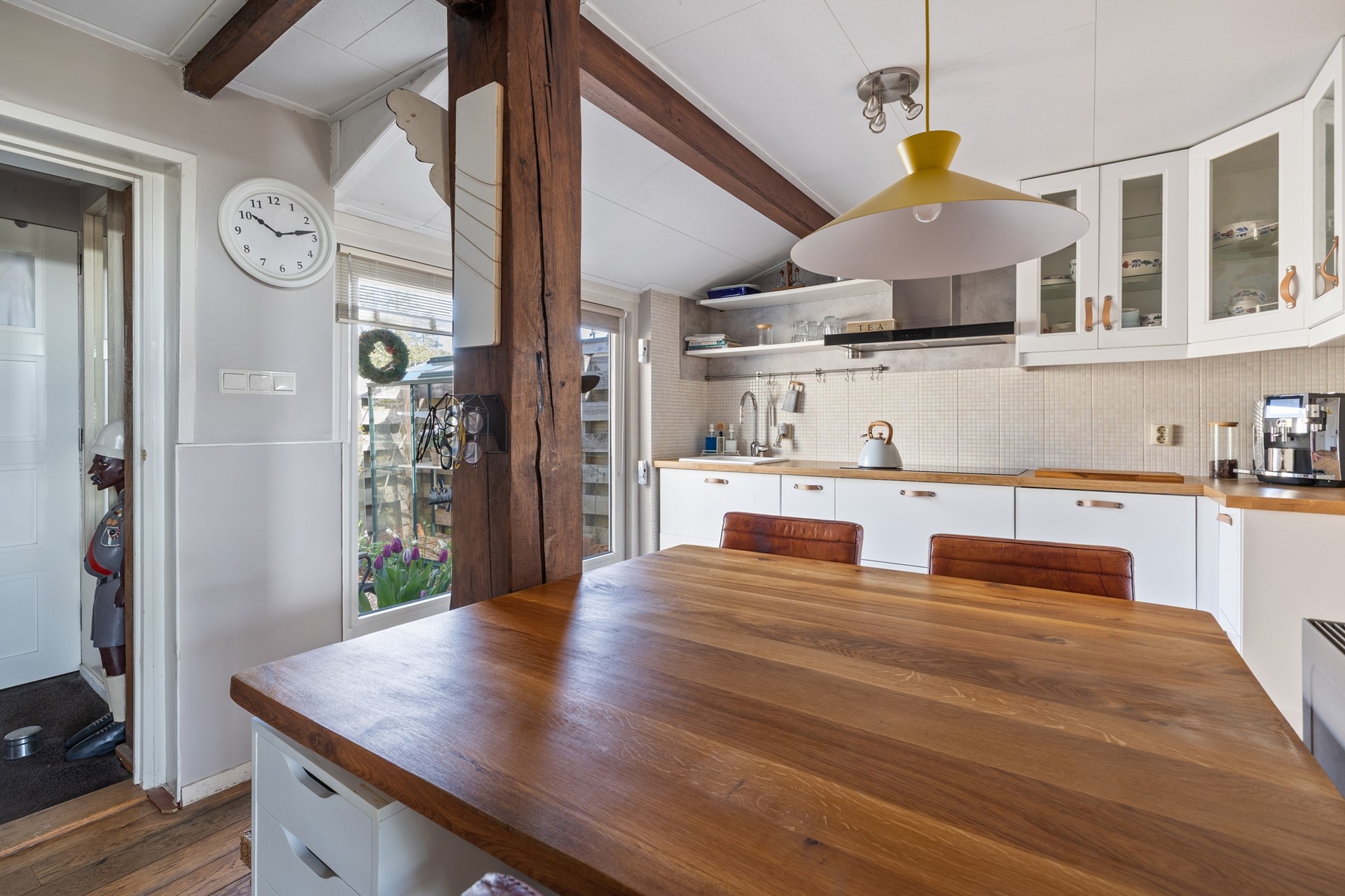 Binnenkomst via het praktische 'klompenhok' naar de hal. De lichte woonkamer loopt over in de moderne keuken, die dankzij de tuindeuren direct toegang biedt tot het terras. Verder vindt u hier de bijkeuken (met trapopgang), een berging, CV-kast en de vernieuwde, stijlvolle badkamer.