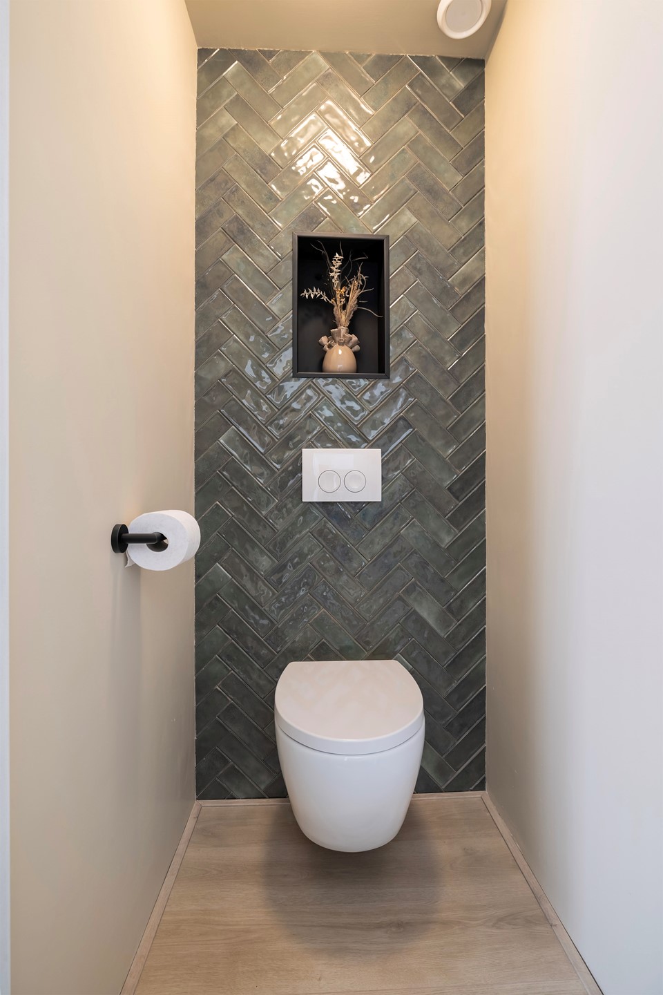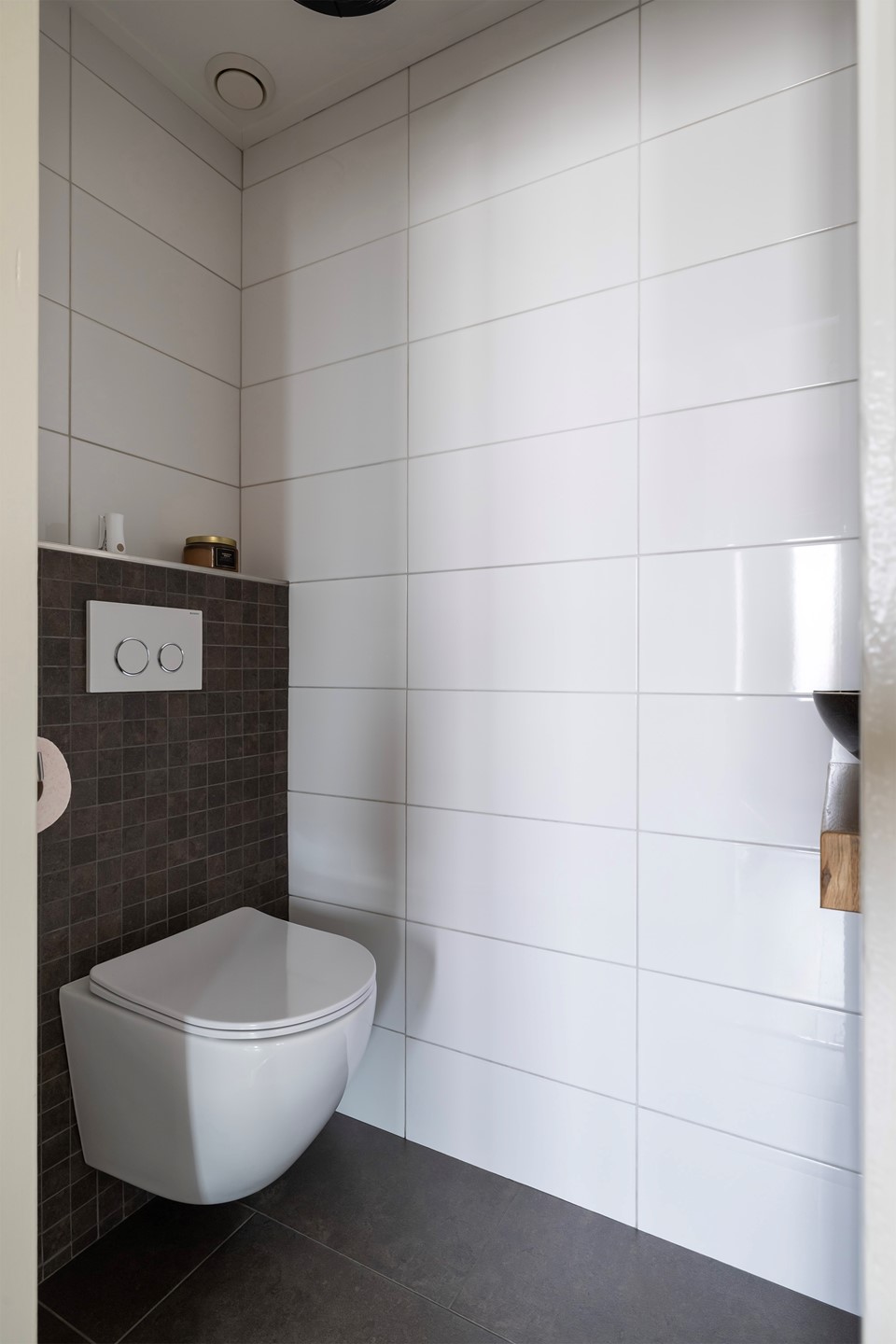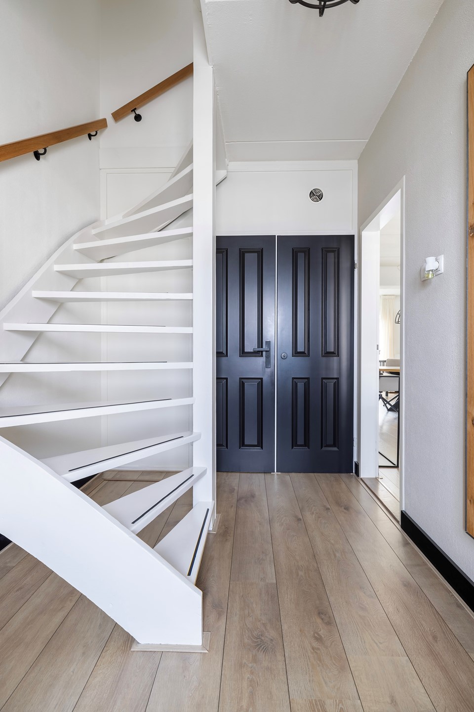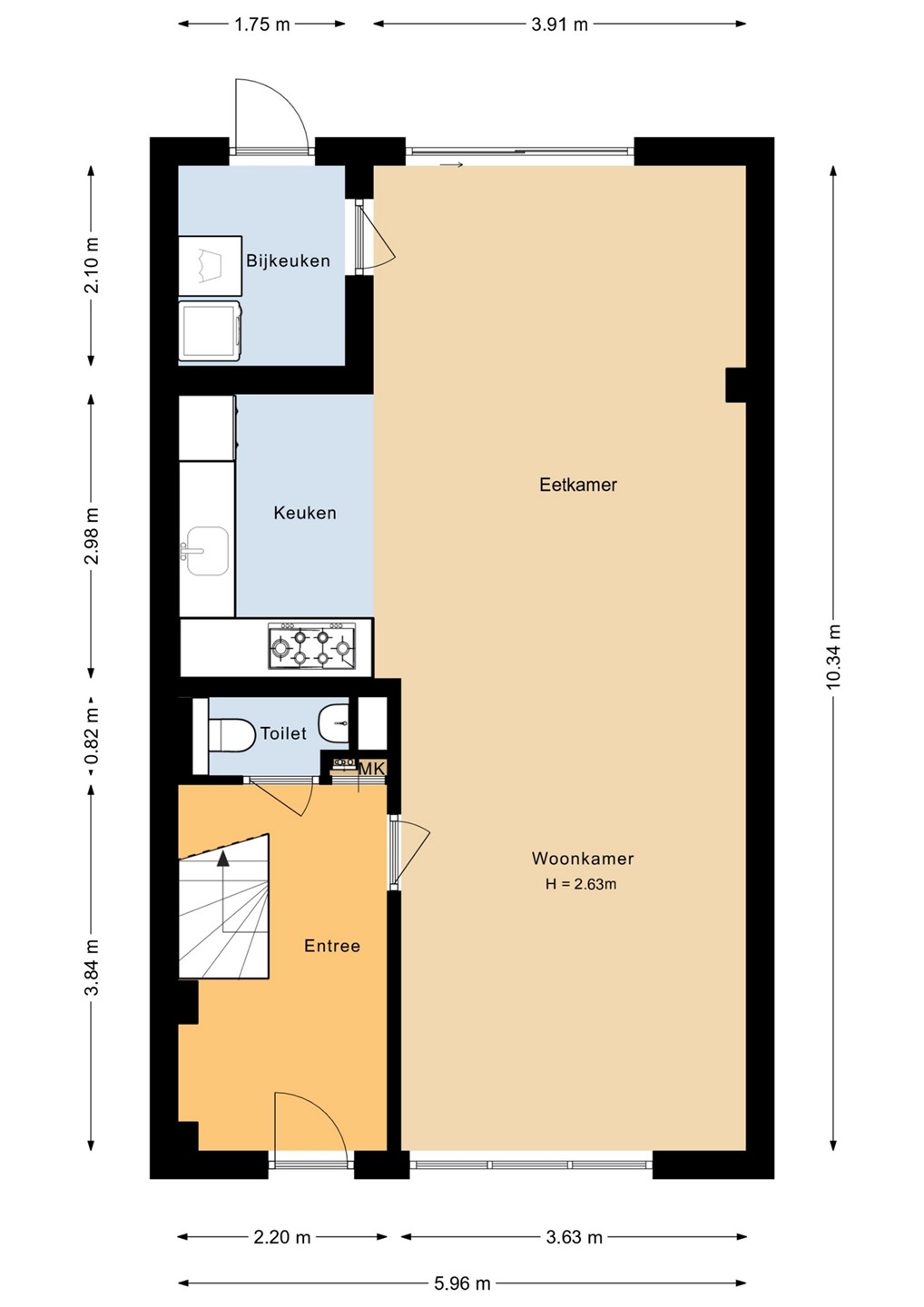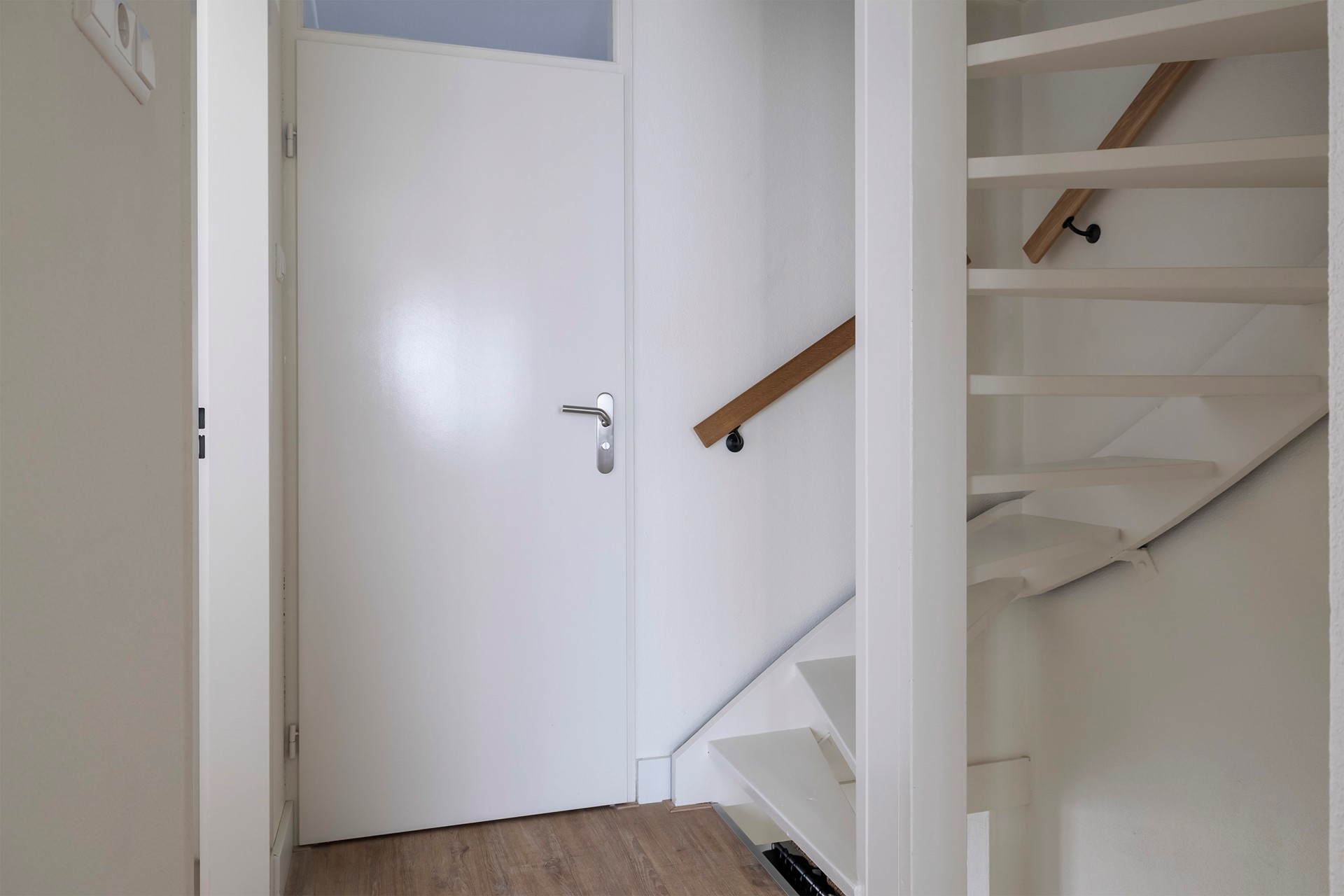 Hal met toilet, trapopgang en meterkast. Vergrote woonkamer met schuifpui, open keuken, bijkeuken.
