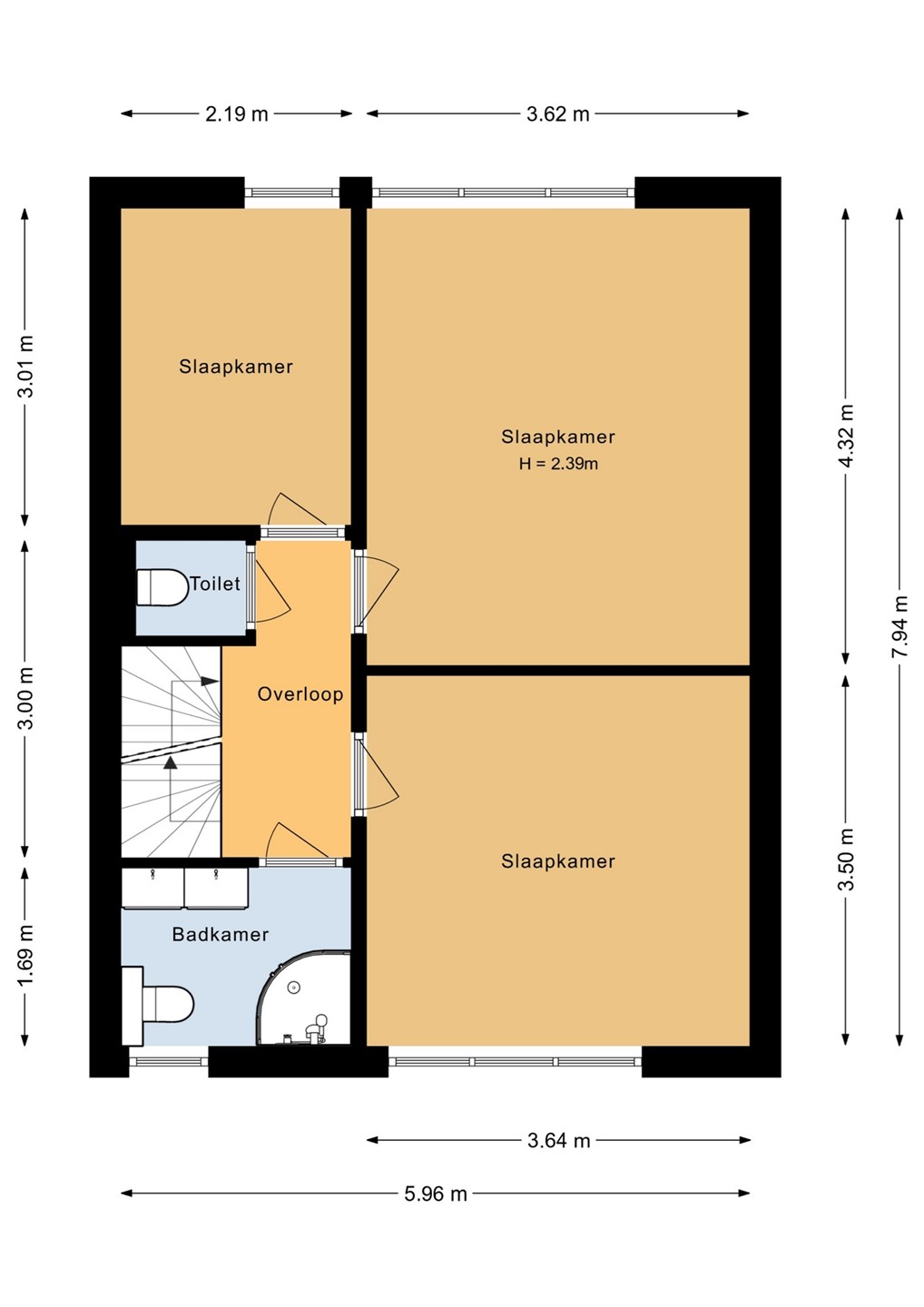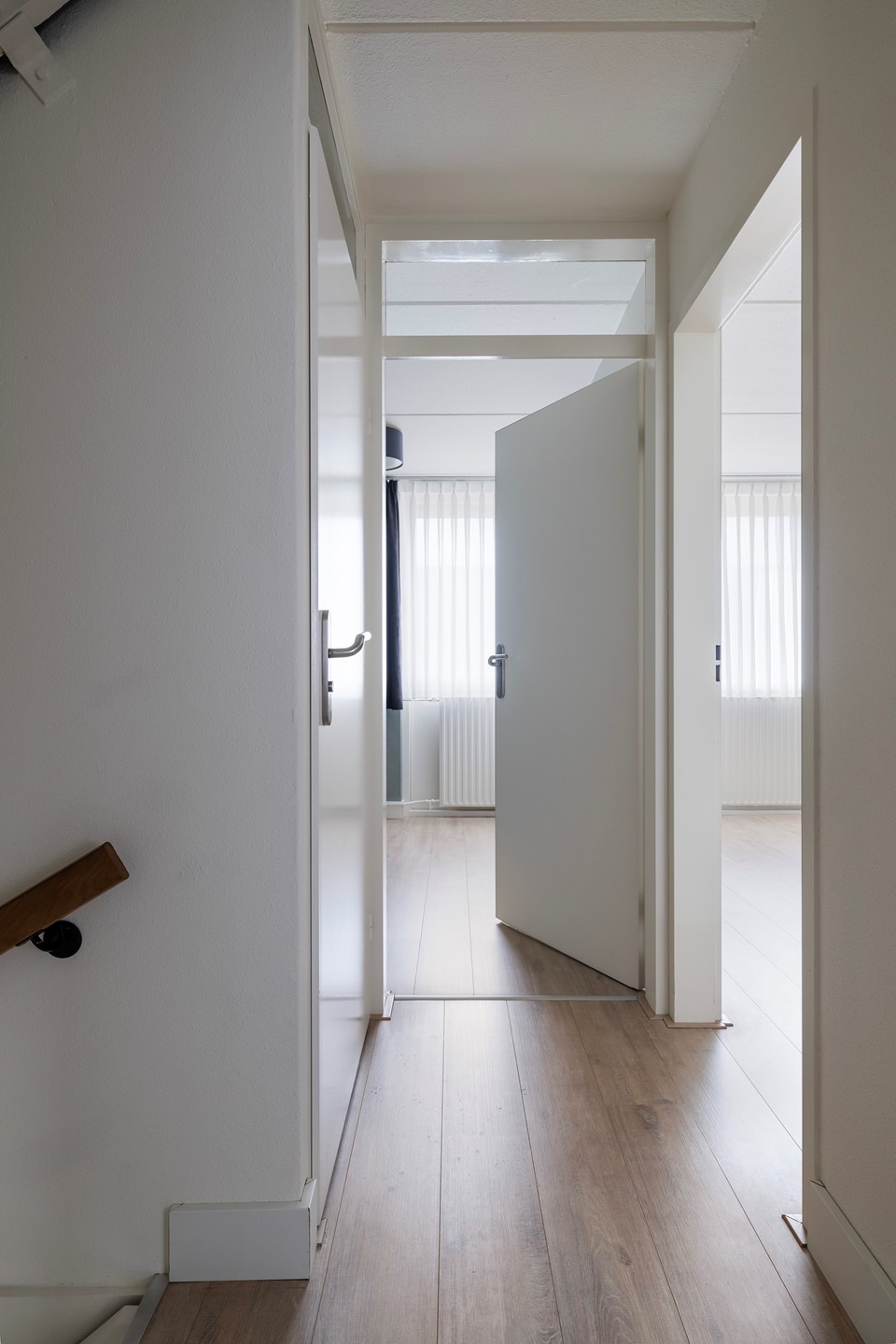Overloop met toilet, 3 slaapkamers, badkamer.
